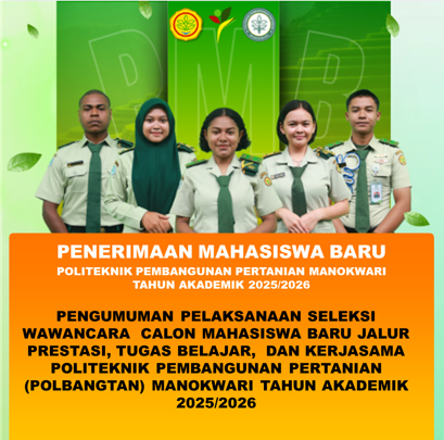 PENGUMUMAN PELAKSANAAN SELEKSI WAWANCARA CALON MAHASISWA BARU JALUR PRESTASI, TUGAS BELAJAR, DAN KERJASAMA POLITEKNIK PEMBANGUNAN PERTANIAN (POLBANGTAN) MANOKWARI TAHUN AKADEMIK 2025/2026