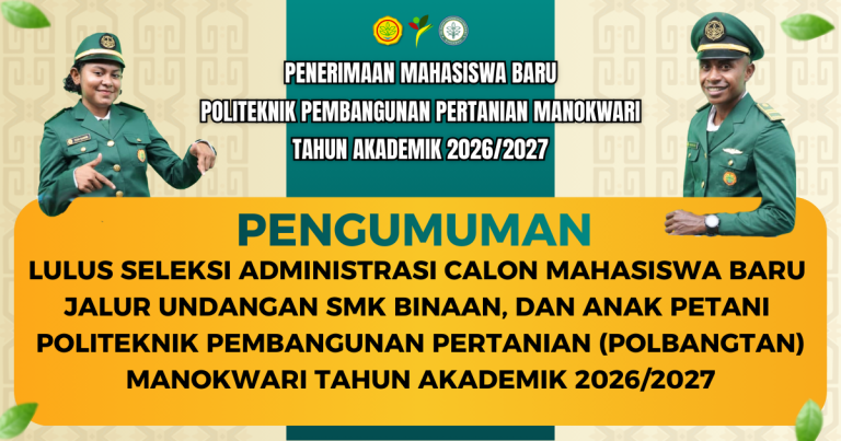 PENGUMUMAN PELAKSANAAN WAWANCARA CALON MAHASISWA BARU JALUR UNDANGAN SMK BINAAN, DAN ANAK PETANI POLITEKNIK PEMBANGUNAN PERTANIAN (POLBANGTAN) MANOKWARI TAHUN AKADEMIK 2026/2027